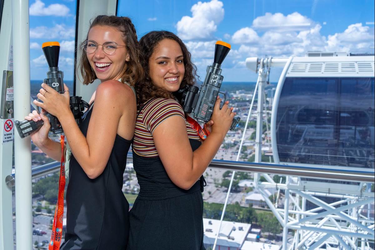 - As their air-conditioned capsule ascends above Orlando, players scan the rooftops of ICON Park to find 50 strategically pre-selected targets with varying degrees of difficulty. To get the highest score possible, players need to hit as many of these as possible with their laser blaster during the 18-minute ride. Each of the custom-made blasters has a scope on it, allowing the players to view an infrared beam and assist them when aiming at the targets. The score is displayed on the side of the blaster and targets flash off and on to confirm a hit.