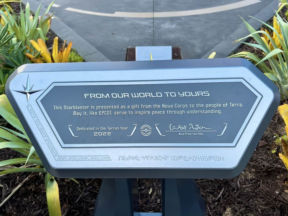 - The plaque feeds more into the story of the attraction, proclaiming the Starblaster has been presented as a gift from the Nova Corps to the people of Terra (Earth). The Plaque also hopes that the ship, “Like EPCOT, Serves to inspire peace through understanding."