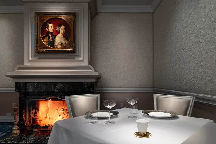 - For a more intimate evening, the private Queen Victoria’s Room offers an expanded prix-fixe tasting menu specially created by the Chef de Cuisine. Set behind frosted-glass doors, this richly appointed room features a glowing fireplace, delicate embroidery, lace details and artwork showcasing European royalty.