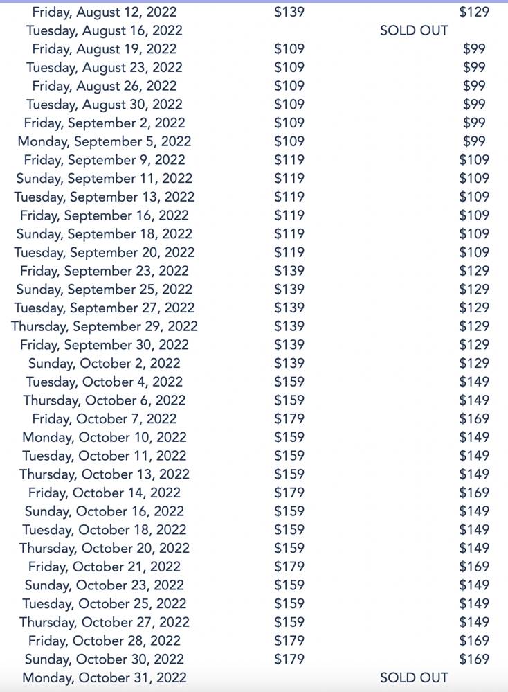 - Not surprisingly, Halloween proper has already sold out, with no tickets available for October 31st’s event night. With dynamic pricing in place, it’s also no surprise that the other sold out night currently reflected on the official website is the first of the cheaper evenings, on Tuesday, August 16th.