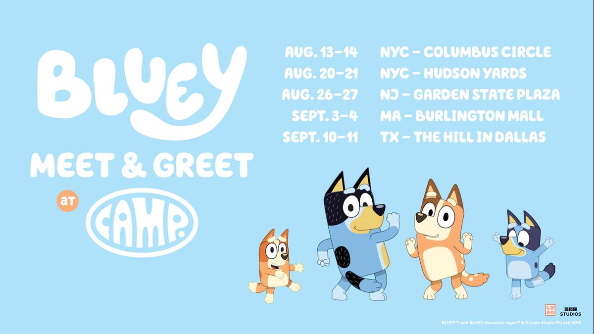 - Bluey is coming to camp and your family is invited! There will be crafts to make, maximum dancing and time to meet your favorite Blue Heeler for real life! Expect family-friendly fun, brought to you by BBC Studios, Moose Toys, and CAMP.