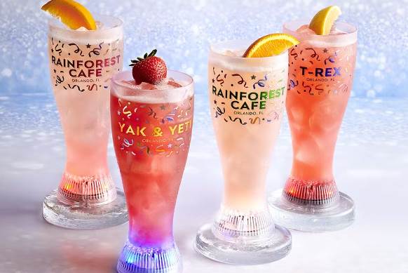 At Rainforest Cafe, you can join as they celebrate with a new dessert and drinks for the 50th anniversary of Walt Disney World. For a limited time only, you can collect four new light-up celebration projector glasses as well as shaker margaritas.