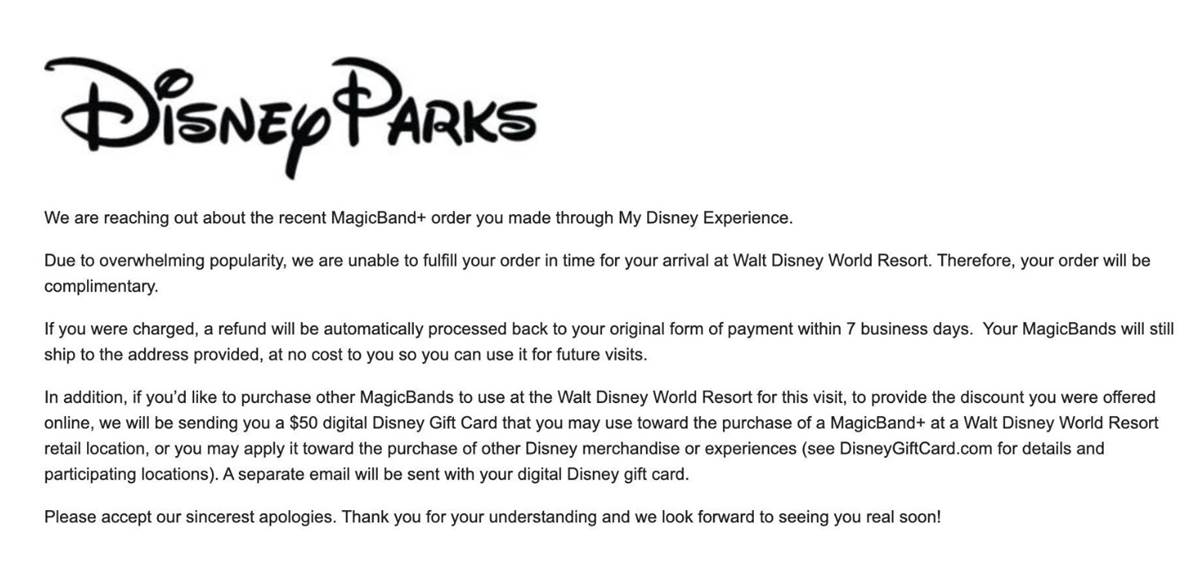 - In addition, Disney is also sending affected guests a $50 digital Disney Gift Card that can be used toward the purchase of a MagicBand+ at a Walt Disney World Resort retail location, or other Disney merchandise or experiences.