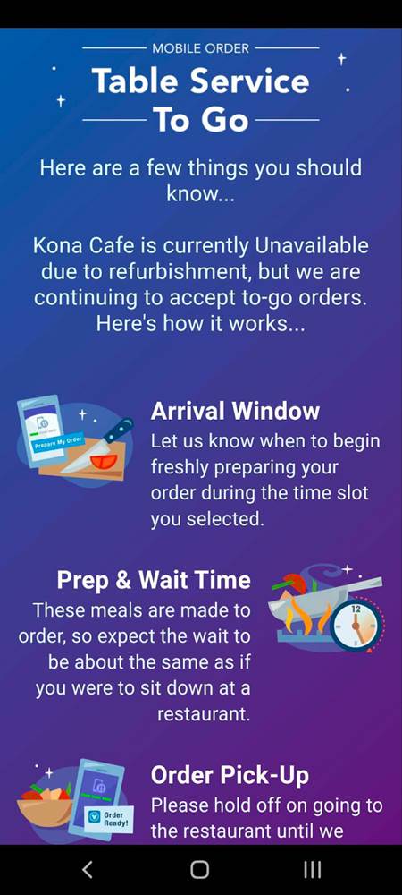 - During this time, Guests may continue to use the Mobile Order service through the My Disney Experience app to order select breakfast, lunch and dinner offerings from Kona Island, the neighboring stand that typically offers pastries, coffee and sushi.