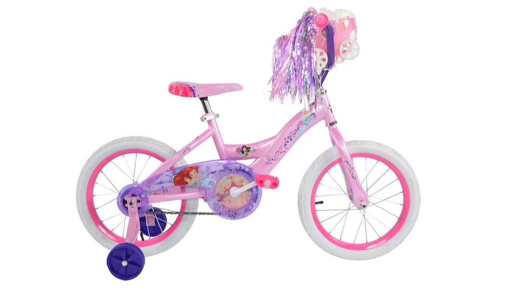 This 16" bike, a perfect first-bike for kids just learning to ride. Wide training wheels add stability and allow your kids to focus on learning how to pedal, brake, and steer without having to worry about balance. They can be moved to a higher position on the back wheel or removed altogether to convert the ride into a big-kid bike. A removable doll Carrier and handlebar streamers add a bit of fun!