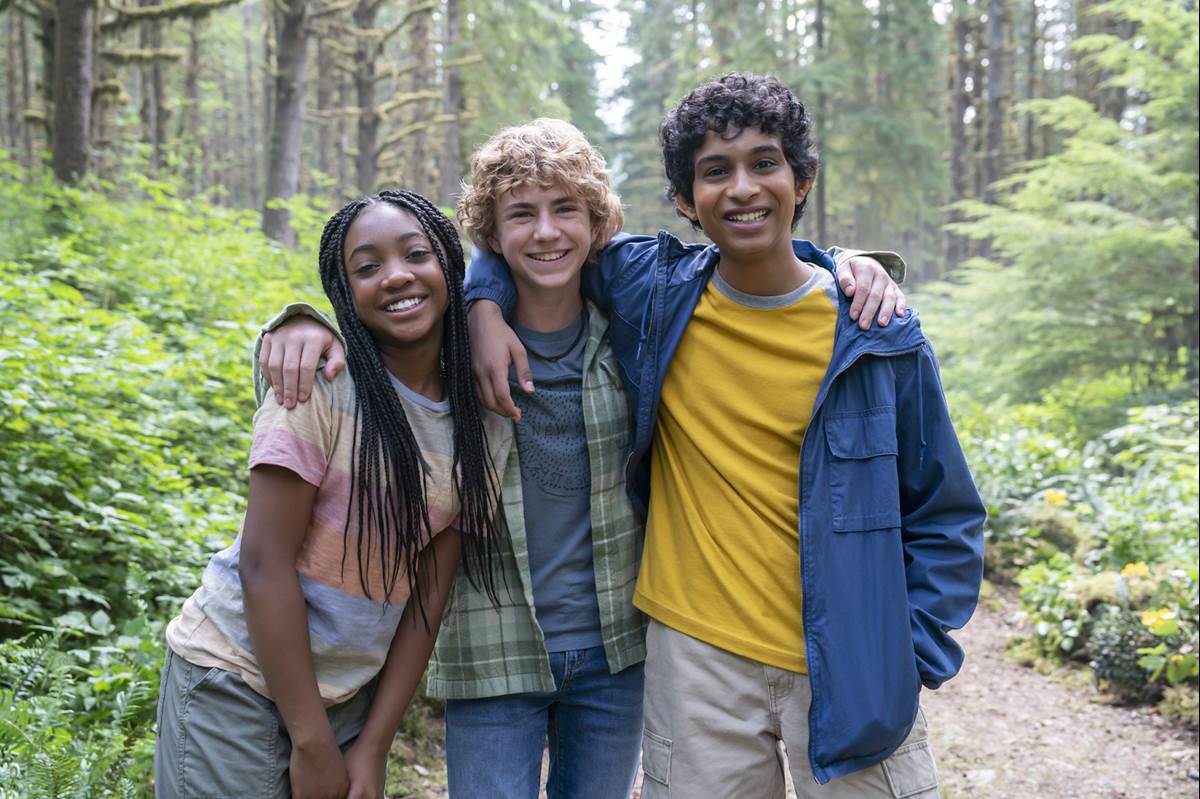 - From left to right, Leah Jeffries' Annabeth Chase, Walker Scobell's Percy, and Aryan Simhadri's Grover are together in the forest, which is most likely the woods of Camp Half-Blood.