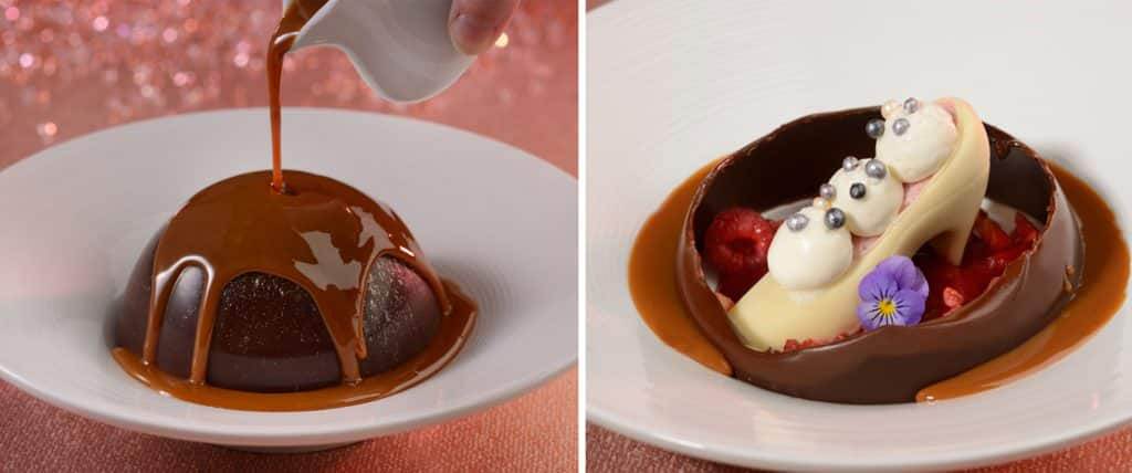 - Lost Slipper: White chocolate mini slipper with white cremeux pearls tucked inside a milk chocolate dome served with hot caramel