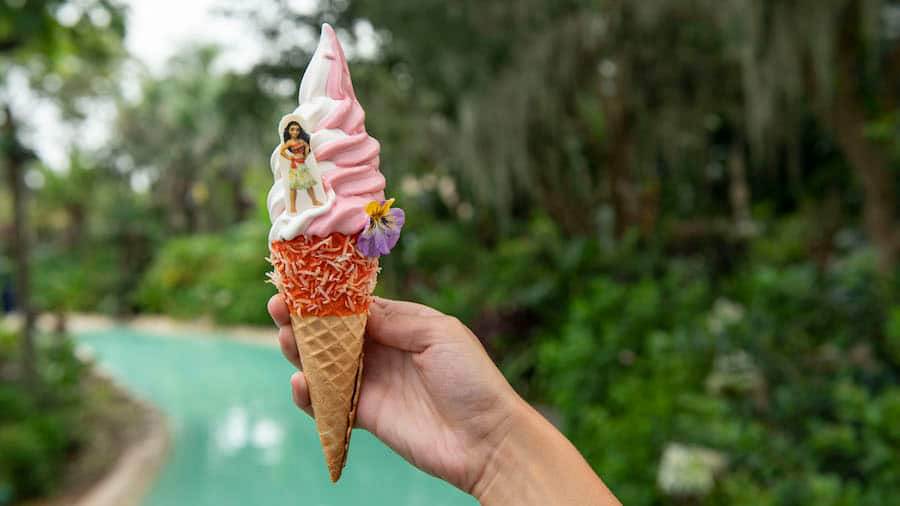 - The Moana Cone: Coconut soft-serve and DOLE Whip strawberry swirled into a chocolate coconut dipped waffle cone with white chocolate and an edible flower (New)