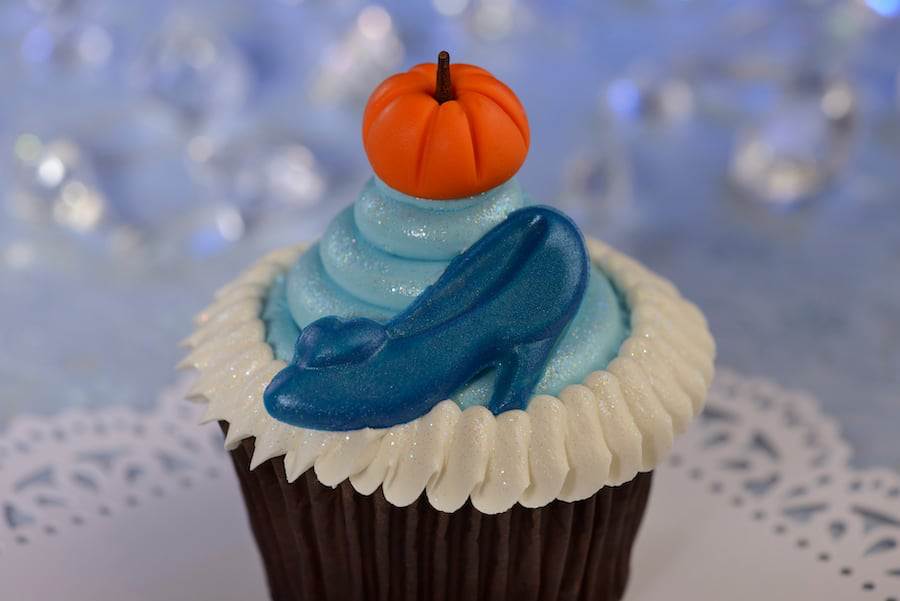 - Cinderella Cupcake: Vanilla cake with vanilla crème custard filling, butter cream, white chocolate slipper, and fondant pumpkin
