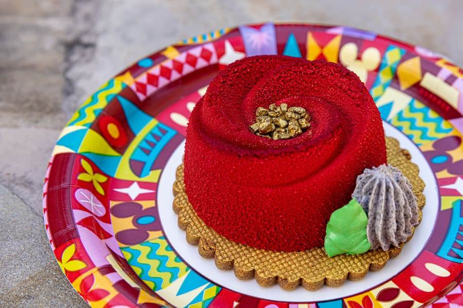 - Enchanted Rose: Dark chocolate, blackcurrant, and morello cherry mousse with whipped cookies ‘n cream fluff, and gilded chocolate-covered cacao nibs on a shortbread cookie