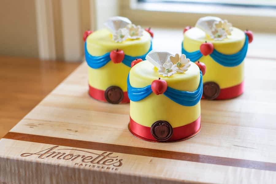 - Snow White 85th Anniversary Petit Cake: Vanilla chiffon cake layered with apple mousse and cinnamon mousse with white chocolate crunch pearls (New)