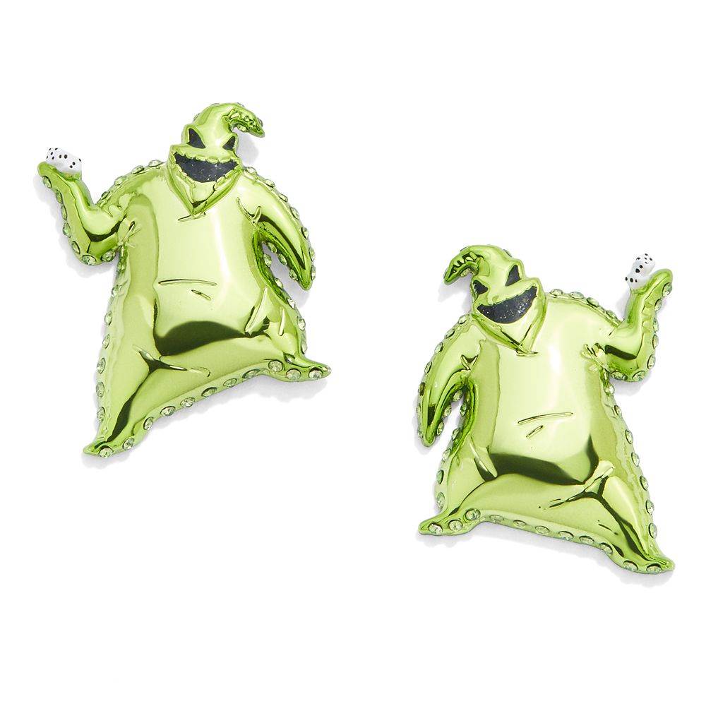 “Normally featured as a bug-filled burlap sack, Oogie Boogie has been given a shiny new makeover. Clutching a pair of dice, the boogeyman is reimagined in metallic green in these detailed figural earrings that include rhinestone accents."