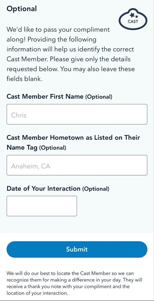 - From there, guests will be taken to a simple form where they can say why they’re thanking a Cast Member, and what location the Cast Members they’re thanking are from.