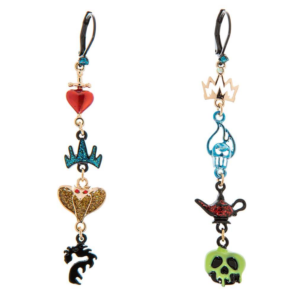 “Betsey Johnson brings her signature playful style to these earrings inspired by Disney Villains." This set features charms of a heart with dagger, Ursula glittering crown, glittering Jafar cobra, Maleficent dragon, Evil Queen crown, Hades skull, glittering magic lamp, and poisoned apple.