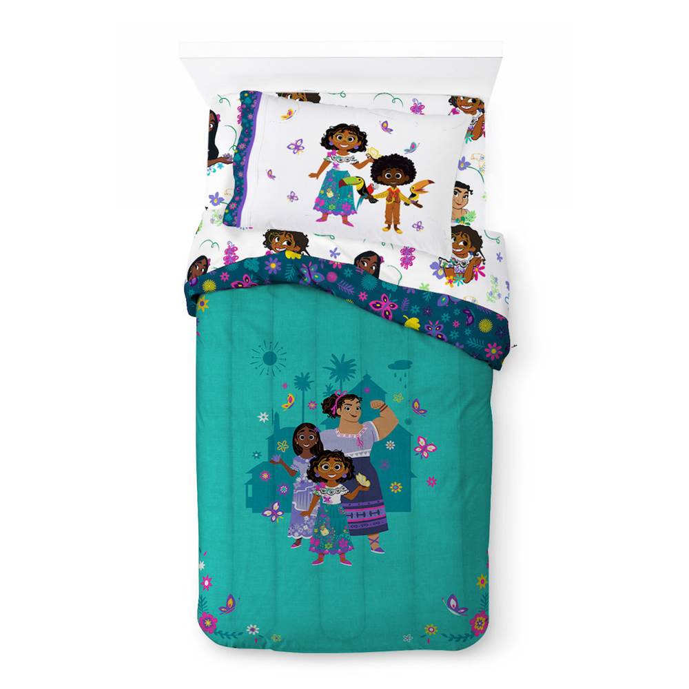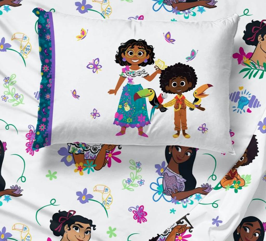 The Encanto 3-piece set is twin sized, includes a pillowcase and fitted sheet, and features your favorite characters from La Familia Madrigal.