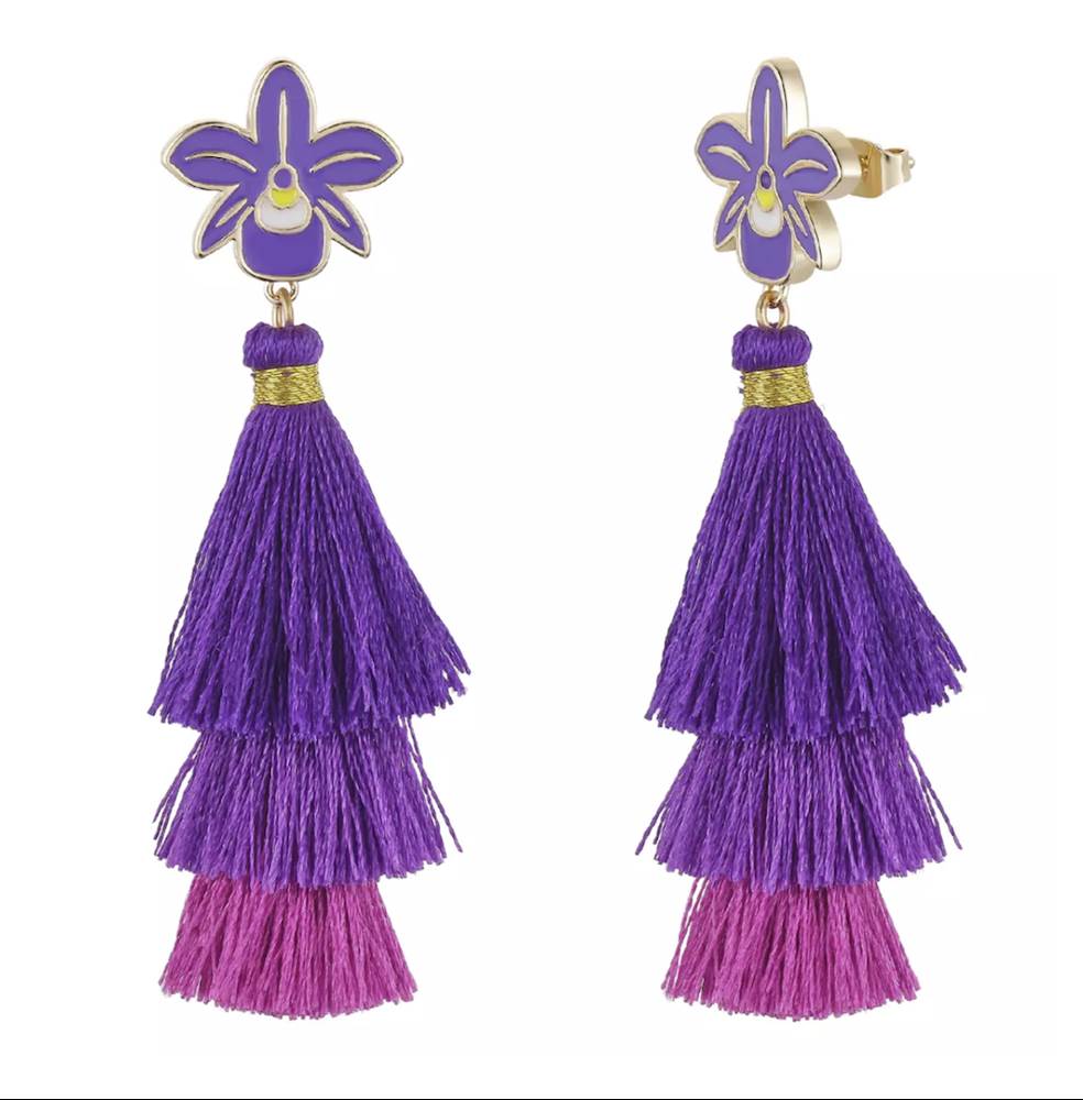 Inspired by the rich colorful palette of Encanto, these dramatic earrings feature a purple enamel orchid from which dangles gorgeous multi-hued purple tassels overlapping each other to give an ombré look.