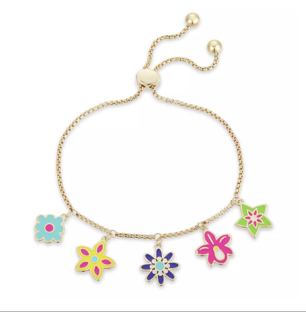 The bolo charm bracelet reflects the lush Colombian mountain setting of the film and features five colorful enamel flower charms.