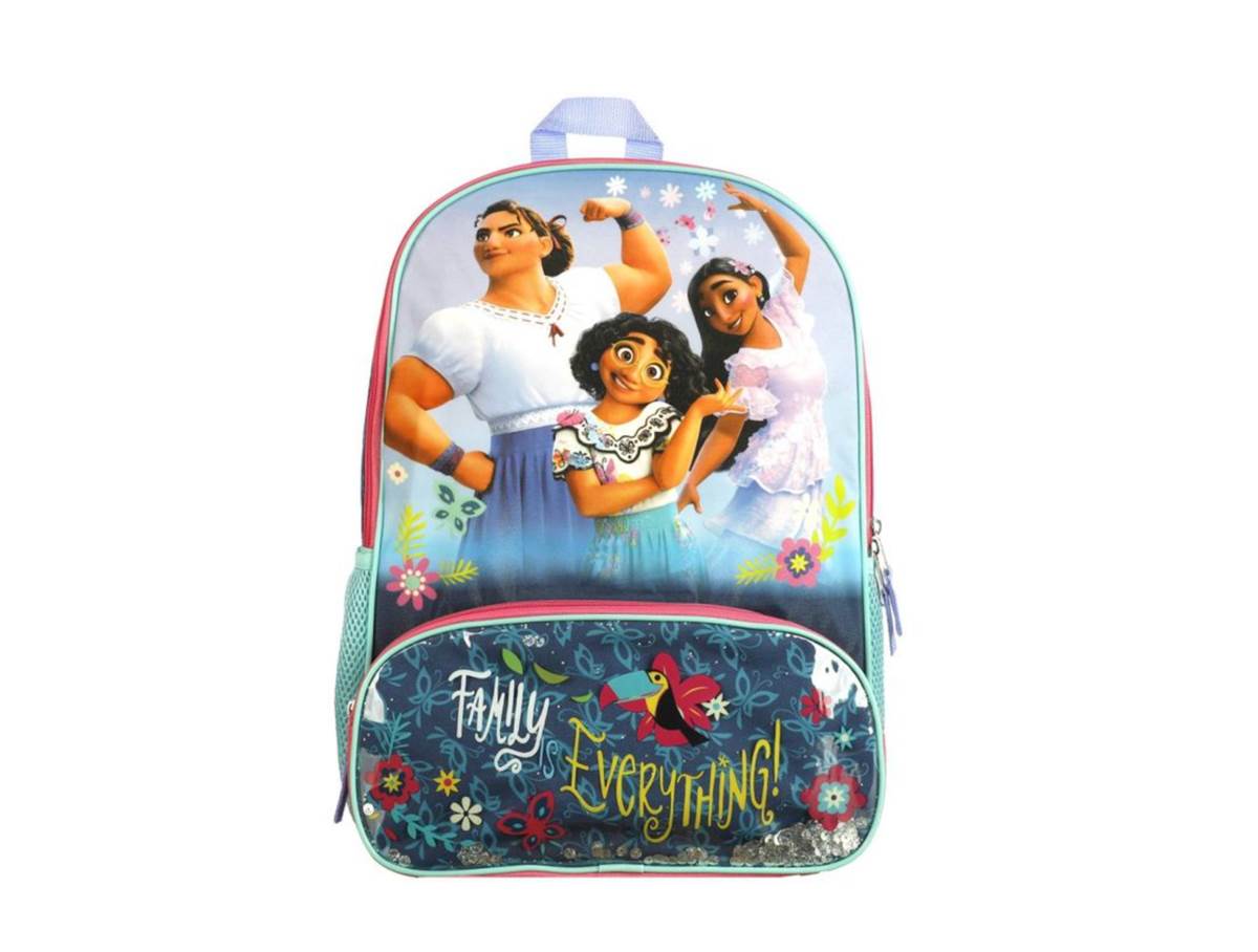 The ‘Family Is Everything’ 16" Backpack shows an image of Luisa, Mirabel, and Isabela in different poses while flowers and a toucan appear on the front pocket. The side mesh pockets are perfect for carrying water bottles, while the padded back and adjustable shoulder straps make carrying school supplies more comfortable.