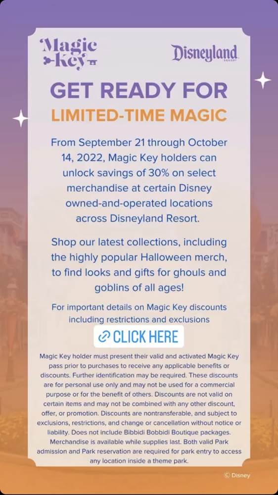- From September 21st through October 14th, 2022, Magic Key holders can unlock savings of 30% on select merchandise at certain Disney owned-and-operated locations across the Disneyland Resort.