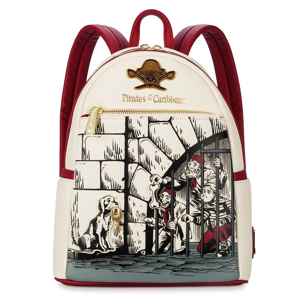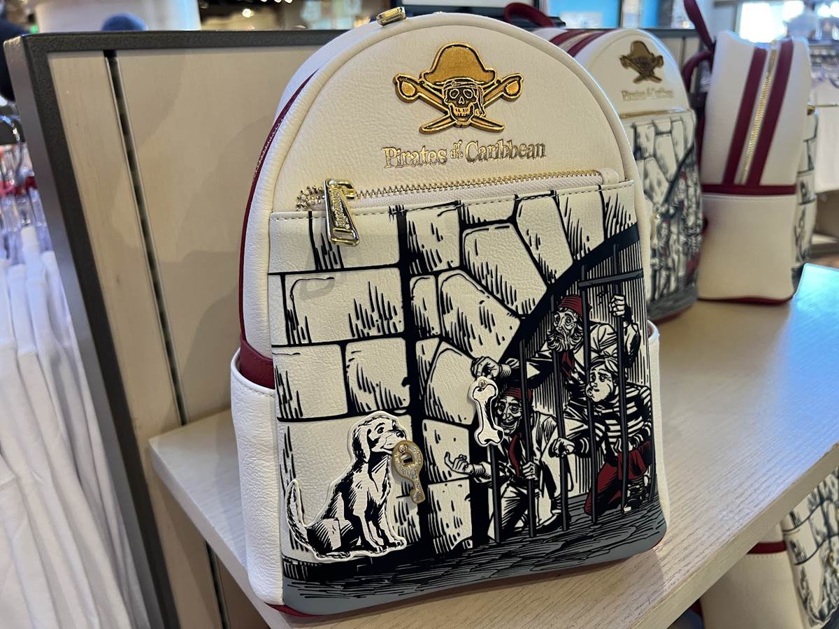 Celebrating one of the most iconic scenes from the attraction, the Loungefly bag features the moment where we see three jailed pirates beckoning a dog who is holding the key to their freedom (quite literally). Even better, the dog bone treat and the aforementioned key are actual dimensional accouterments adorned upon the mini-backpack. The bag also features the attraction logo, complete with skull and crossbones design at the top of the back pack.