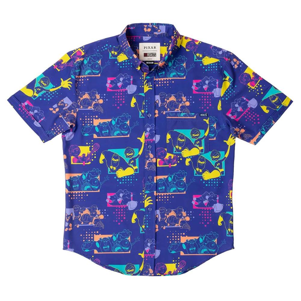 “Whether cooking up a plan to save Metroville or cooking up a meal to serve a hungry patron, the heroes of Pixar know that teamwork makes the dream work. From Miguel and Dante to Mike, Sulley, and Boo, this neon, pop-art style button down features dynamic duos and triumphant trios who have joined forces to save the day ."