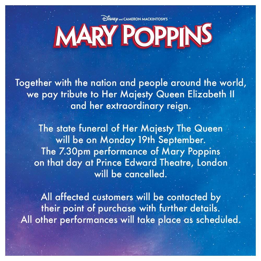 - The 7:30pm performance of Mary Poppins on Monday, September 19th has been canceled due to the state funeral of Her Majesty The Queen.