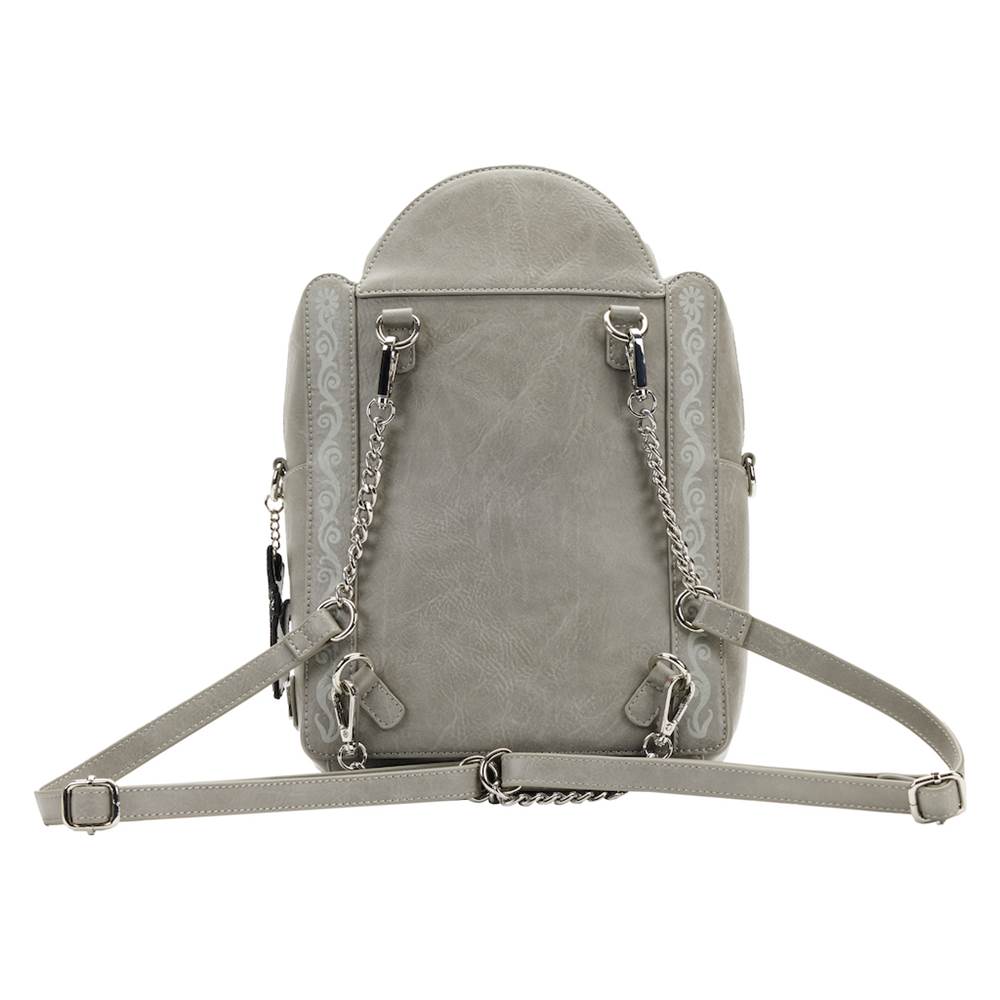 The Hocus Pocus Here Lies Emily Binx Convertible Crossbody Bag will be your new go-to interchangeable accessory this Halloween!. Designed after the headstone of Emily Binx—the late sister of Thackery— the front features a glow in the dark epitaph describing Emily’s early fate from the wicked Sanderson Sisters. Attached is a Thackery Binx velvet bag charm. This bag can transform into a backpack or be worn as a crossbody purse.