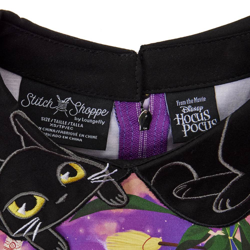 The Sanderson Sisters are high over Salem where they’re concocting their next mischievous (and probably deadly) plan! Loungefly has captured the spirit of the witchy trio on this colorful dress that shows each sister riding her favorite mode of transport (broom, vacuum or mop) across a sunsetting sky. For some added fun, the Thackery Binx is curled up around the black collar with his face on one side and back paws on the other.