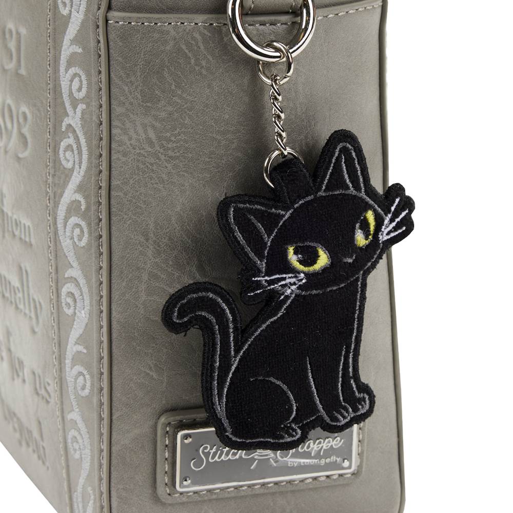 The Hocus Pocus Here Lies Emily Binx Convertible Crossbody Bag will be your new go-to interchangeable accessory this Halloween!. Designed after the headstone of Emily Binx—the late sister of Thackery— the front features a glow in the dark epitaph describing Emily’s early fate from the wicked Sanderson Sisters. Attached is a Thackery Binx velvet bag charm. This bag can transform into a backpack or be worn as a crossbody purse.