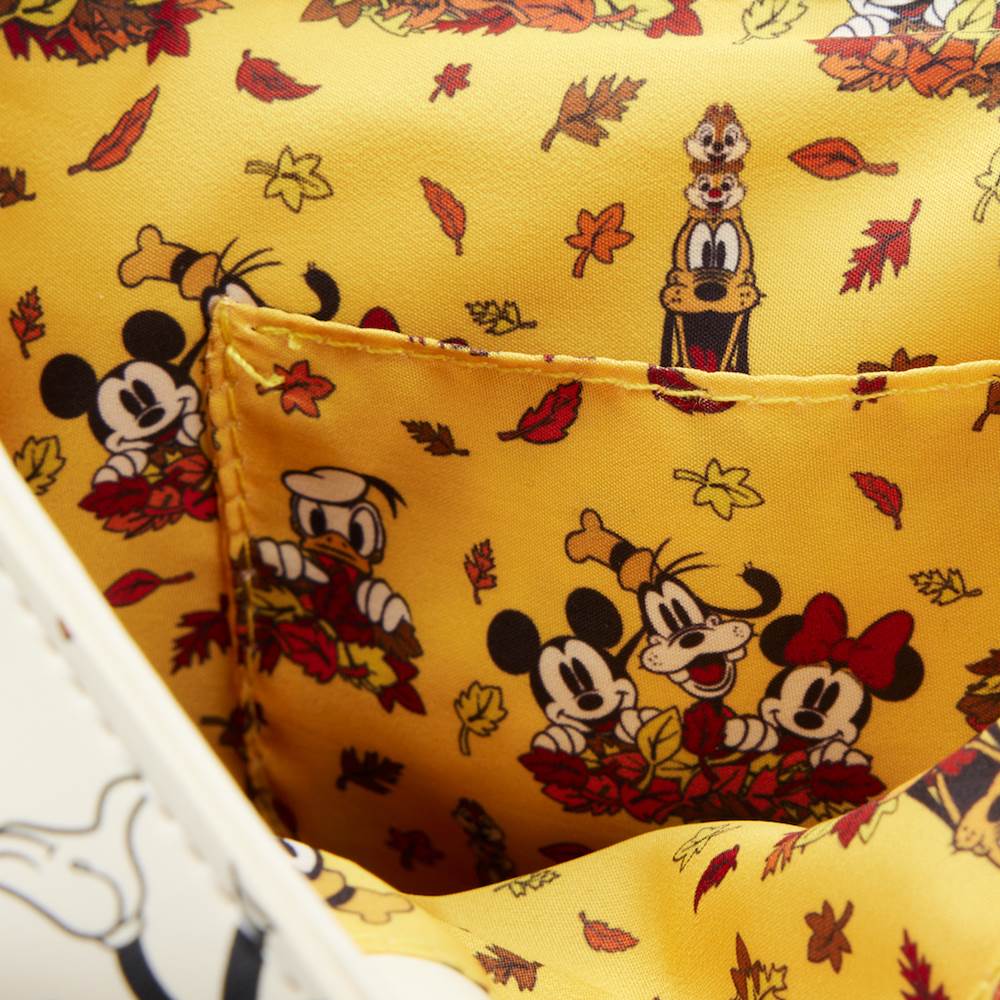 The charming pattern from the mini backpack makes its way to the outside of this cute crossbody bag. A charming bow featuring some fall leaves sits comfortably between two Mickey Mouse ears and the interior showcases the whole gang posing for a fall family photo.