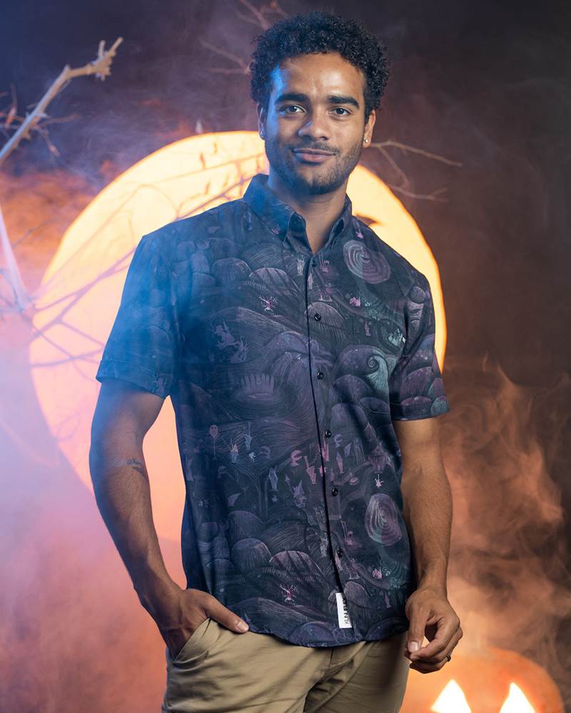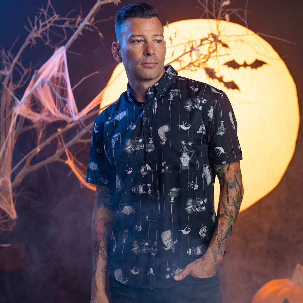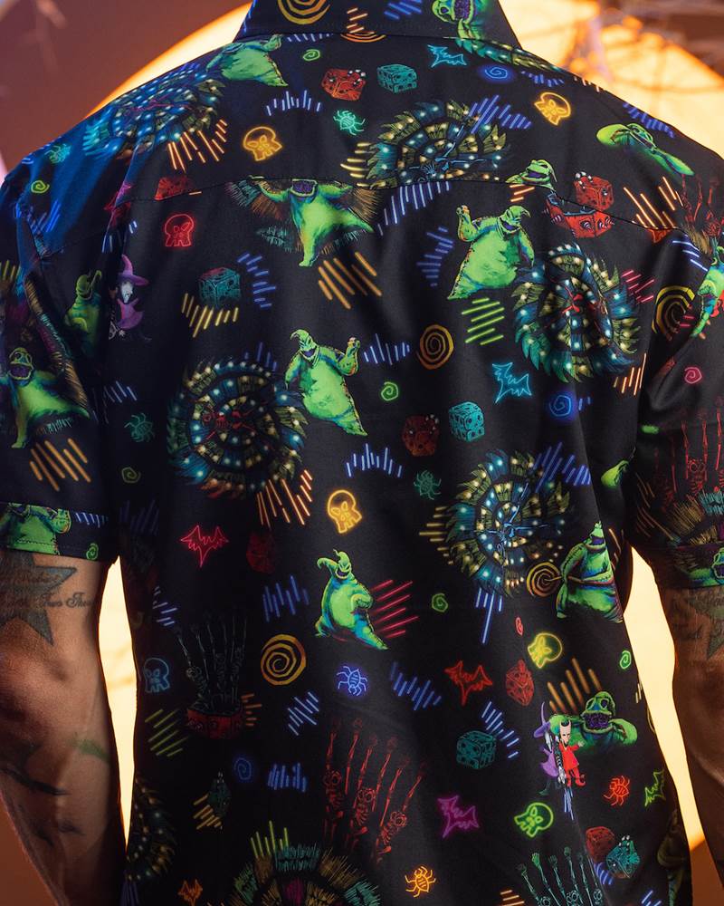 “Being bad never sounded so good. Welcome to Oogie’s lair, where we all learned that the bug-filled boogeyman could, well, boogie. Bust a move and belt a few terrifying tunes in this colorful button down that’ll have you ready to groove on into spooky season, Lock, Shock, and Barrel.“