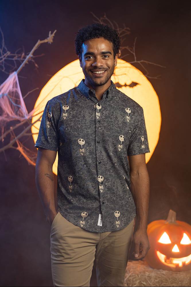 “Jack is back! Add some Skellingtons to your closet with this scary-cool button down featuring “Bone Daddy" himself. The Pumpkin King of Halloween Town is prominently featured amongst a chorus of creepy creatures including Oogie Boogie, Mayor, Dr. Finkelstein, and more. And if you look closely, you may even spot another holiday icon making an earlier than usual appearance. Check twice."