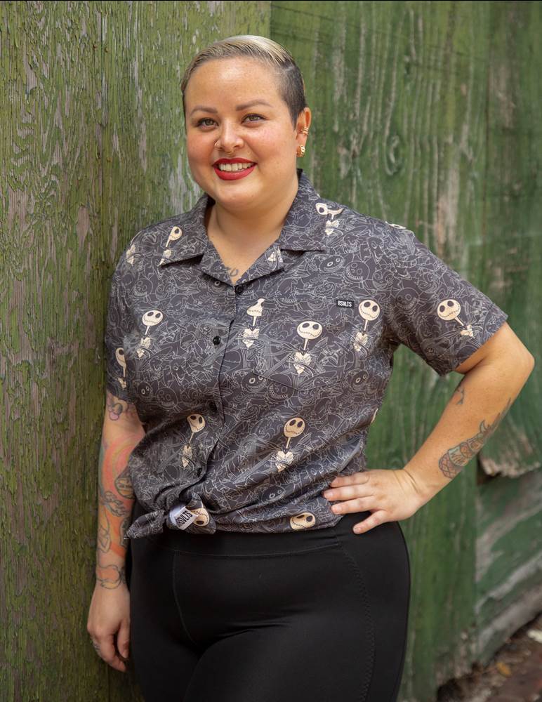 “Looking to get away this fall? Take a trip to boo-tiful Halloween Town, where the topography is terrifying, the structures are spooky, and the citizens spontaneously serenade you with scary songs. This multi-toned button down will make you feel like you’re hangin’ at the town square fountain with Jack, Sally, and the rest of your favorite pals."