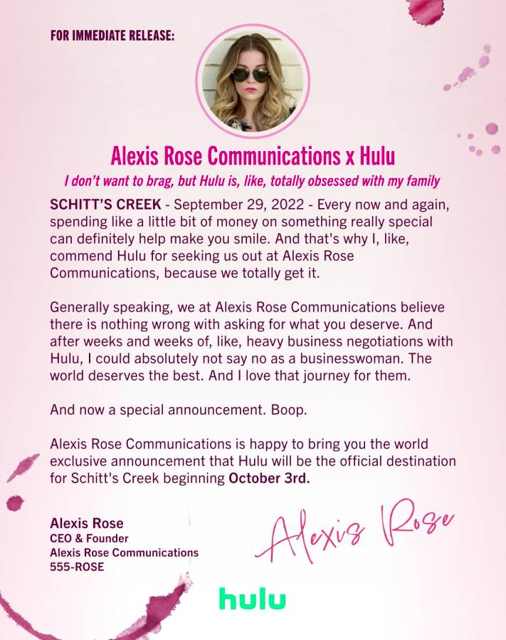 - And that's why I, like, commend Hulu for seeking us out at Alexis Rose Communications, because we totally get it.