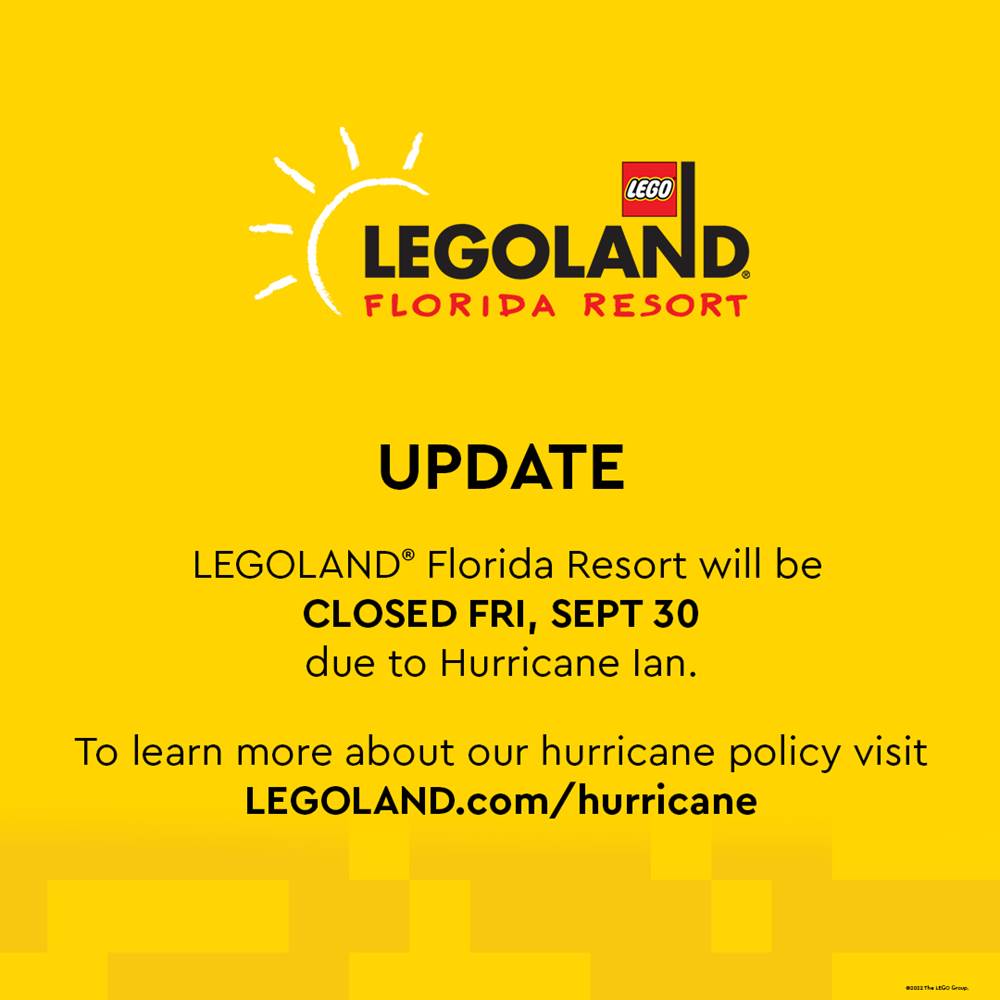 - LEGOLAND Florida Resort, including LEGOLAND Florida Theme and Water Park, as well as Peppa Pig Theme Park, will be closed Friday September 30th due to Hurricane Ian.