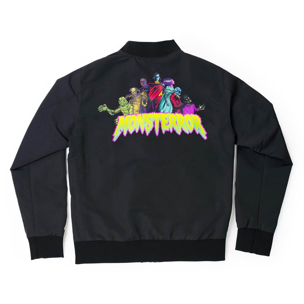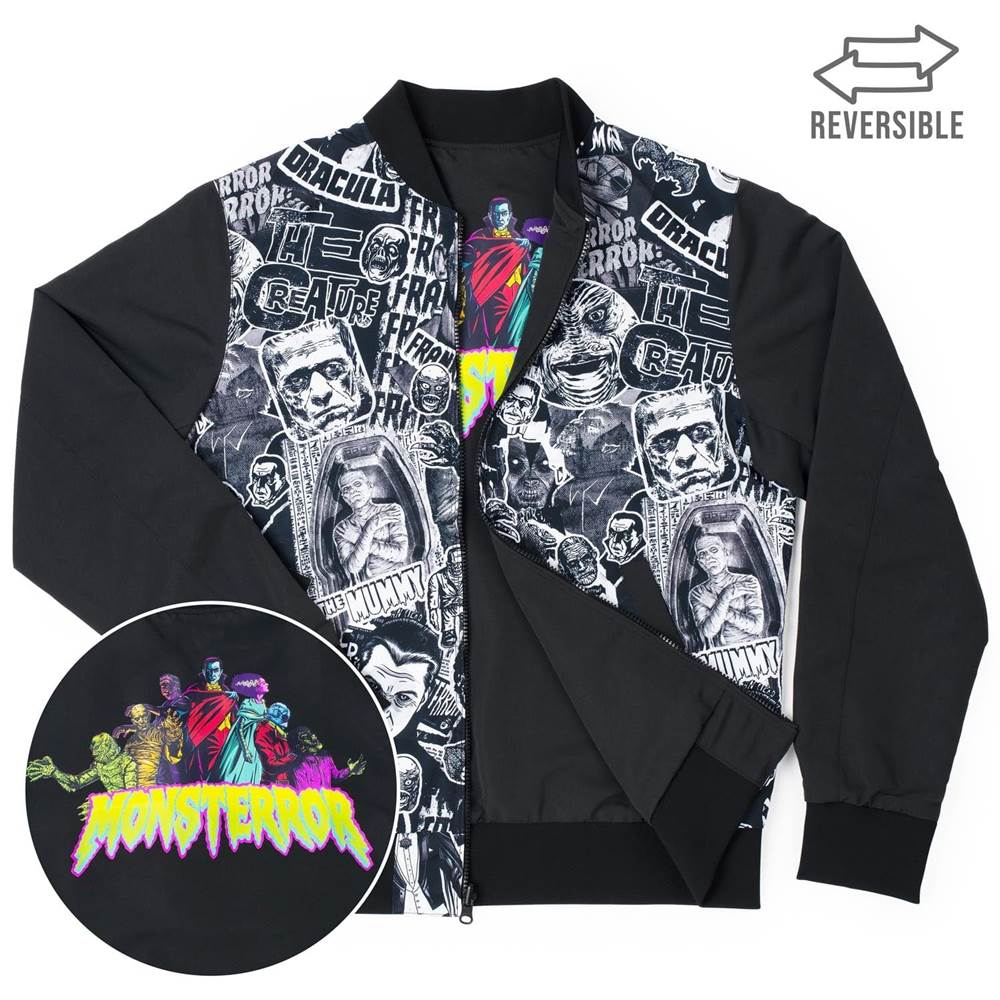 “What's your style? What are you going for? Is it to simultaneously delight and horrify friends, family, and onlookers everywhere? Well, then do we have something for you….With a beautifully black and white hodgepodge of some of the most classic creatures, monsters, and mummies to even grace this earth on one side and the official, full-color Universal Monsters logos featured on the front and back of the other side, this jacket will keep you stylin' all through the spooky season."