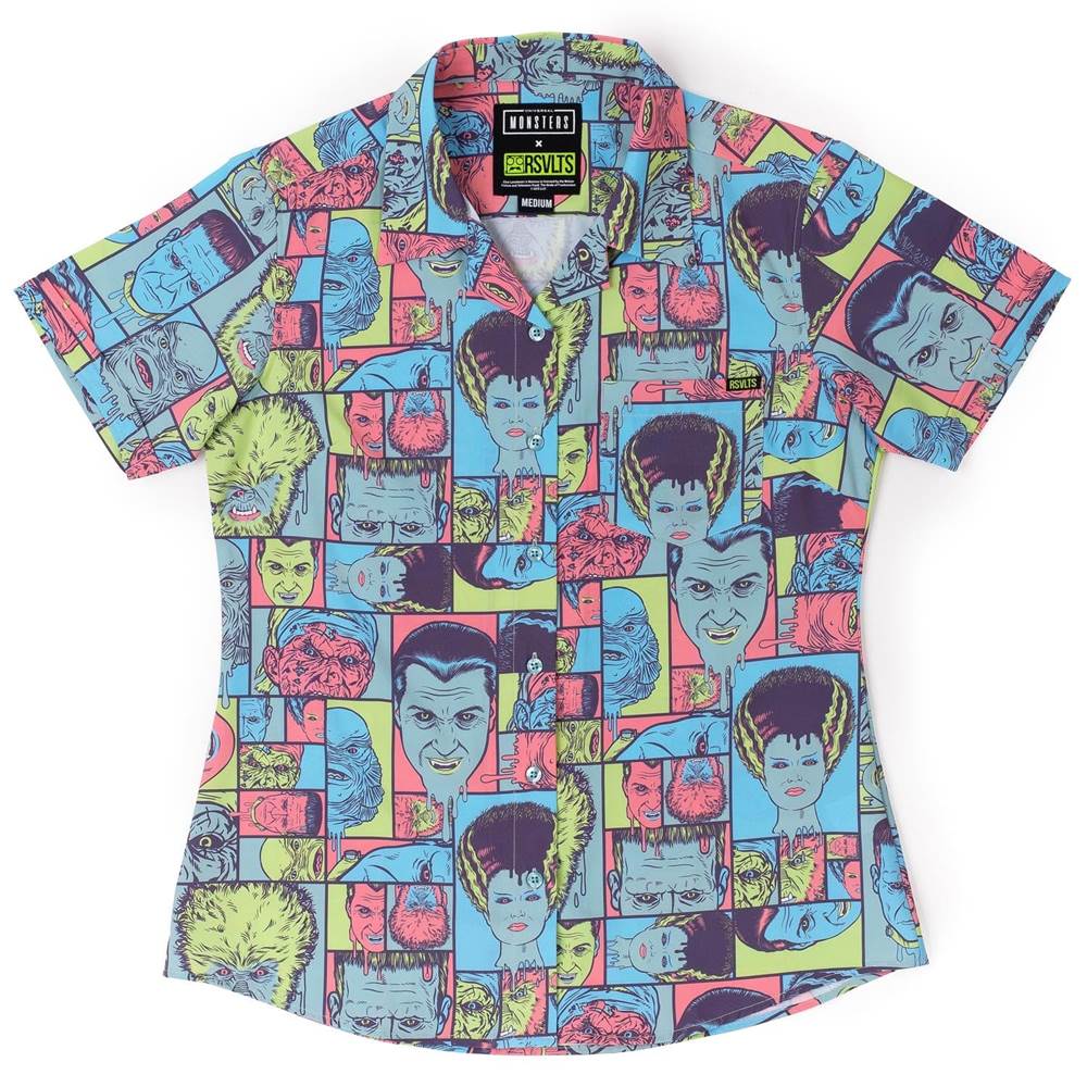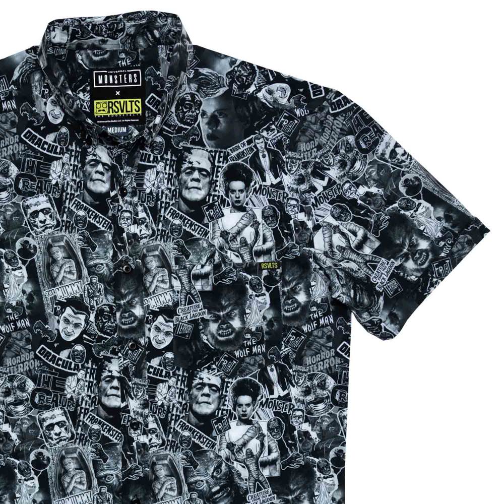 “What's your style? What are you going for? Is it to simultaneously delight and horrify friends, family, and onlookers everywhere? Well, then do we have something for you… It's the official Universal Monster Mashup! This button down is a beautifully dark hodgepodge of the most classic creatures, monsters, and mummies to even grace this earth. From Frankenstein's Monster to Count Dracula to the Creature from the Black Lagoon, this shirt will keep you stylin' all through the spooky season.“