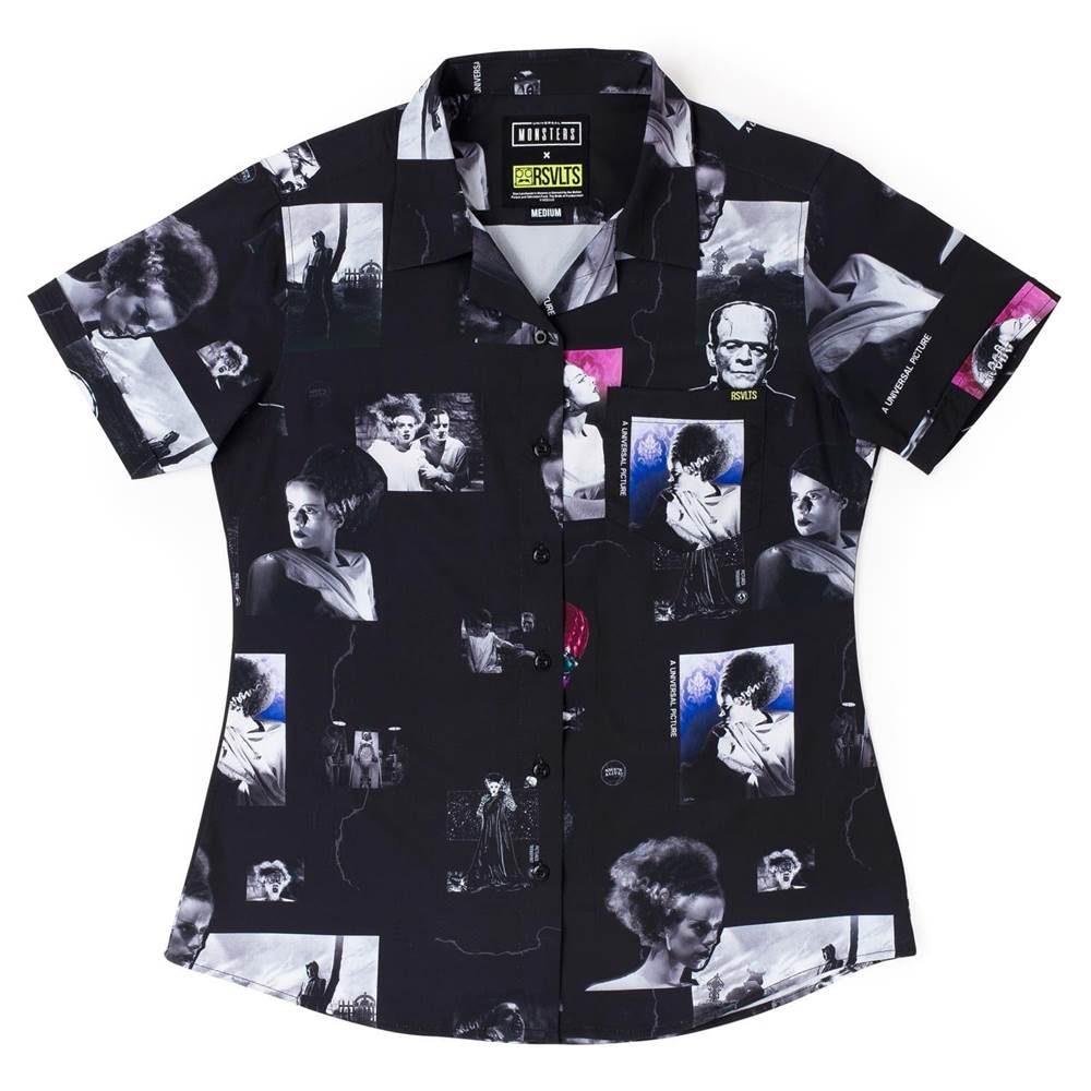 “....friend? Featuring official photography from the 1935 classic, Bride of Frankenstein, this eerie button down is a darkly... romantic?... tribute to Frankenstein's Monster and the Bride he basically scared back to death. Love is cruel."