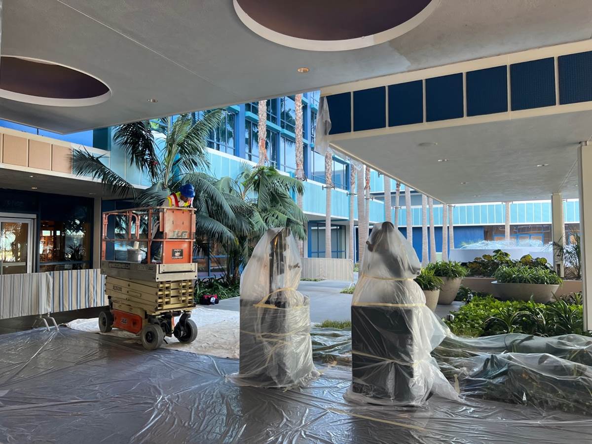 These Mickey and Minnie statues are wrapped up as work takes place on the porte-cochère.
