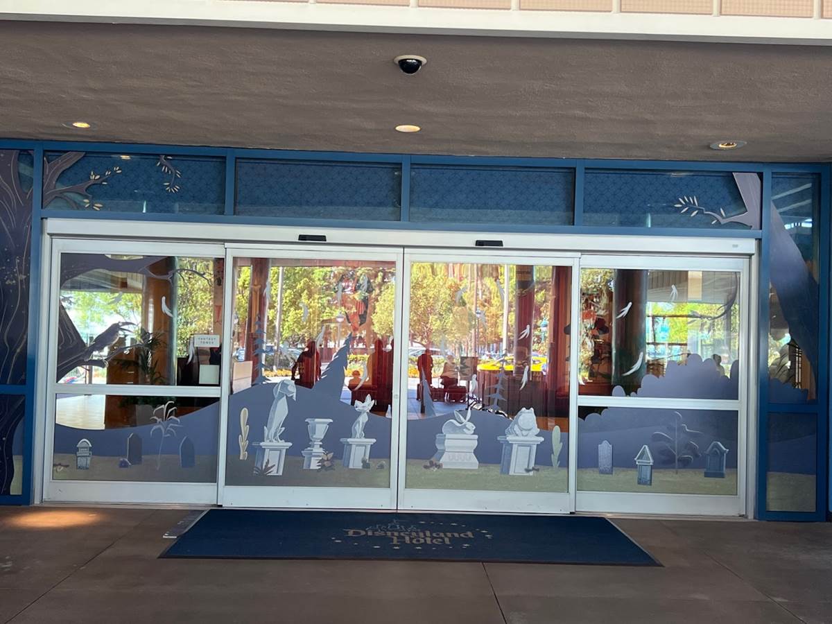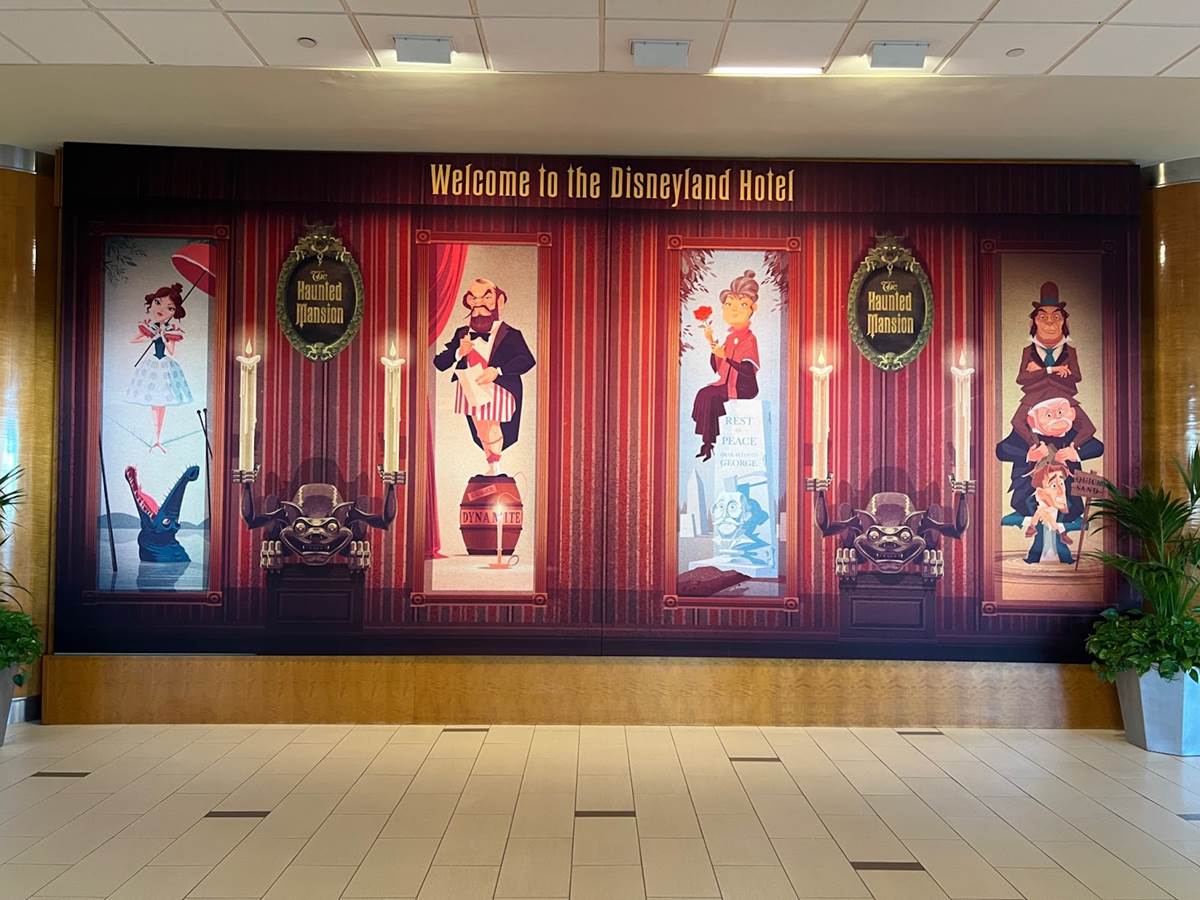 The lobby is decked out for Halloween with some fantastic artwork inspired by The Haunted Mansion.
