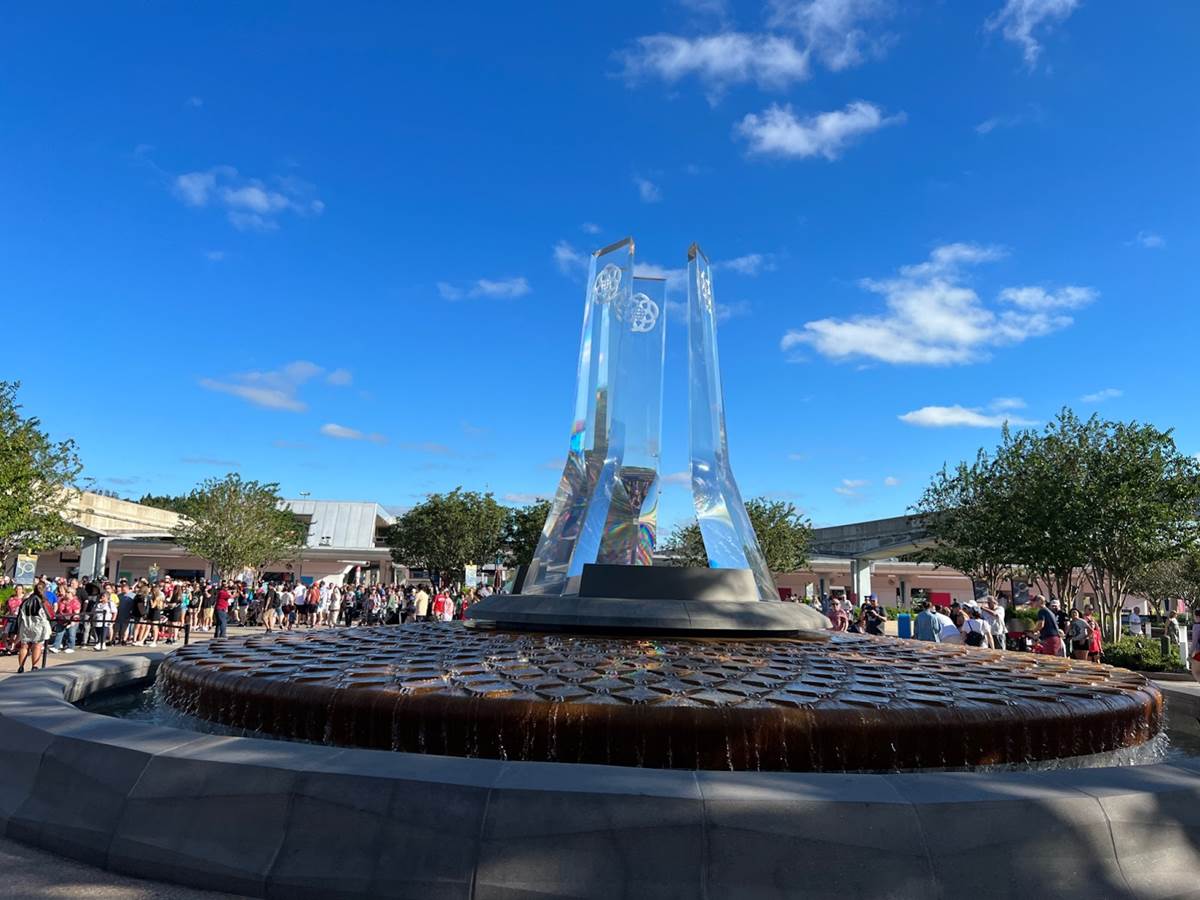 The fountain was running, with lots of non-Early Entry guests waiting to enter the park behind.