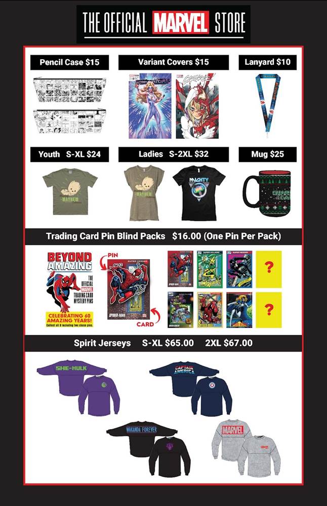 - Fans will want to stop by the official Marvel store (right next to the main marvel booth) for convention-exclusive merchandise including t-shirts, spirit jerseys, comic book variants, and more! Apparel includes fan favorites like X-Men, Spider-Man, Ghost Rider, and the lovable Jeff the Land Shark. Celebrate Spider-Man’s anniversary with a special edition mystery pin set. There are a total of 8 pins.