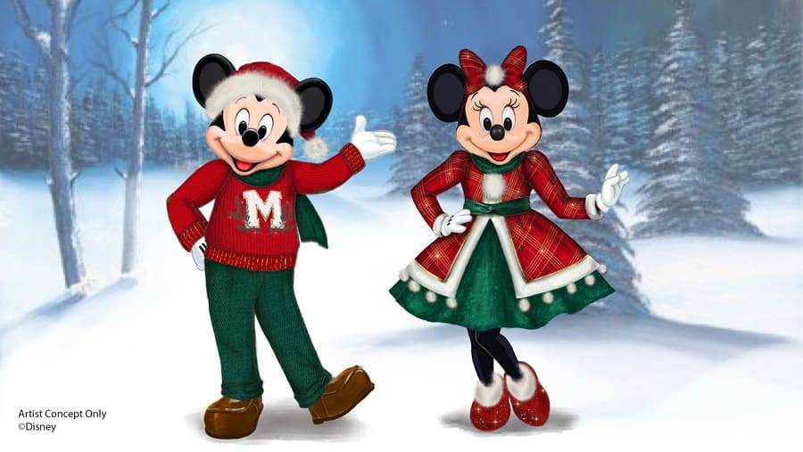 - Celebrating the season with their snazzy style, Mickey Mouse, Minnie Mouse and their pals will don their holiday finest and newest fashions in Town Square at Disneyland park! These festive new looks reflect this year’s warm, vintage-inspired holiday celebration. In classic red and green, their holiday attire is being designed in wintry textures and patterns such as velvet, chenille, herringbone and plaid, and accented with gold for a touch of sparkle.
