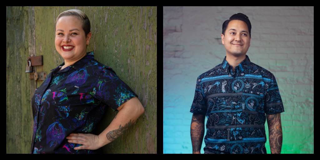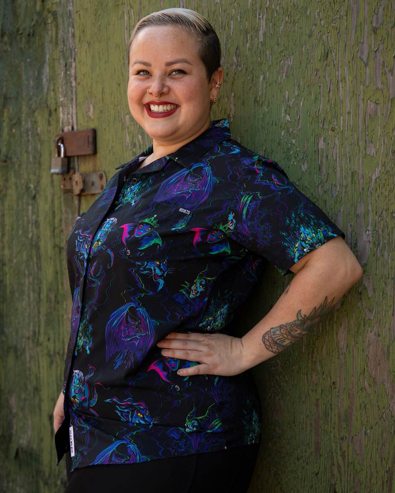 Disney baddies take center stage on this all black button down that’s infused with brilliant neon blues, greens, purples and pinks. As for the aforementioned villains, Chernabog looms nearby, the Evil Queen has a look that could kill, Ursula just wants your voice, Scar has a score he’d like settled and Hades is the stuff of nightmares! It seems like a few other sinisters souls are lurking here too…can you spot them all?