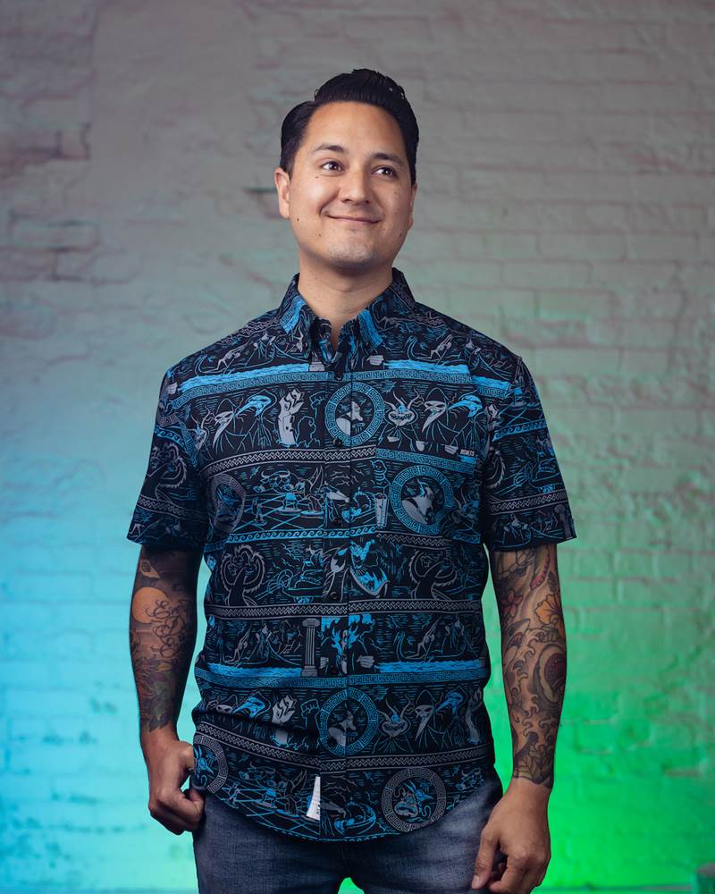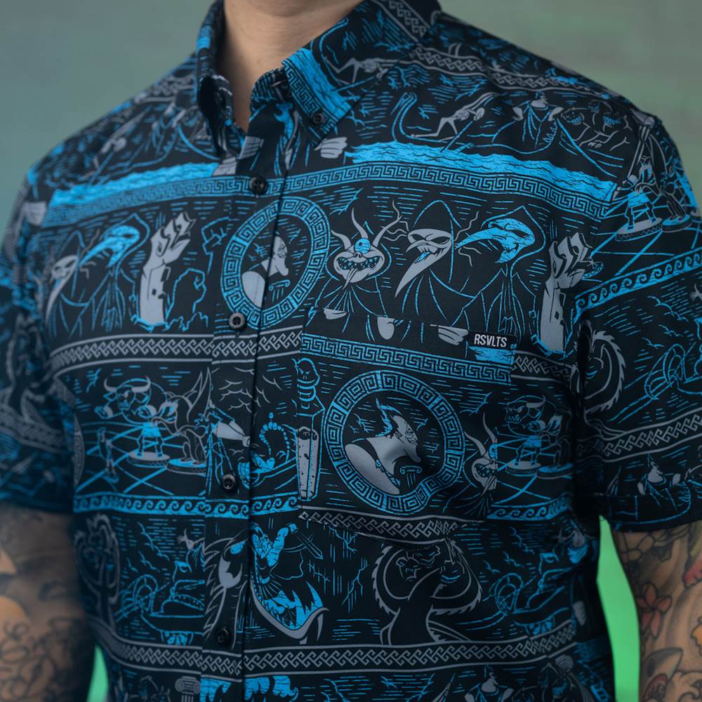 As Lord of the Underworld Hades had command over the dead, but you don’t need his power to command attention with this killer shirt! The black button down features muted greys and a brilliant blue (we love, love, love it!) to depict Hades, the Fates, some skeletons and even Cerberus—the three headed guard dog!