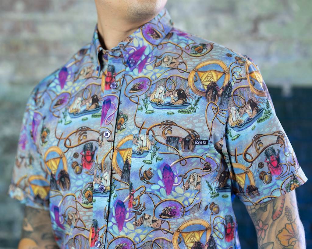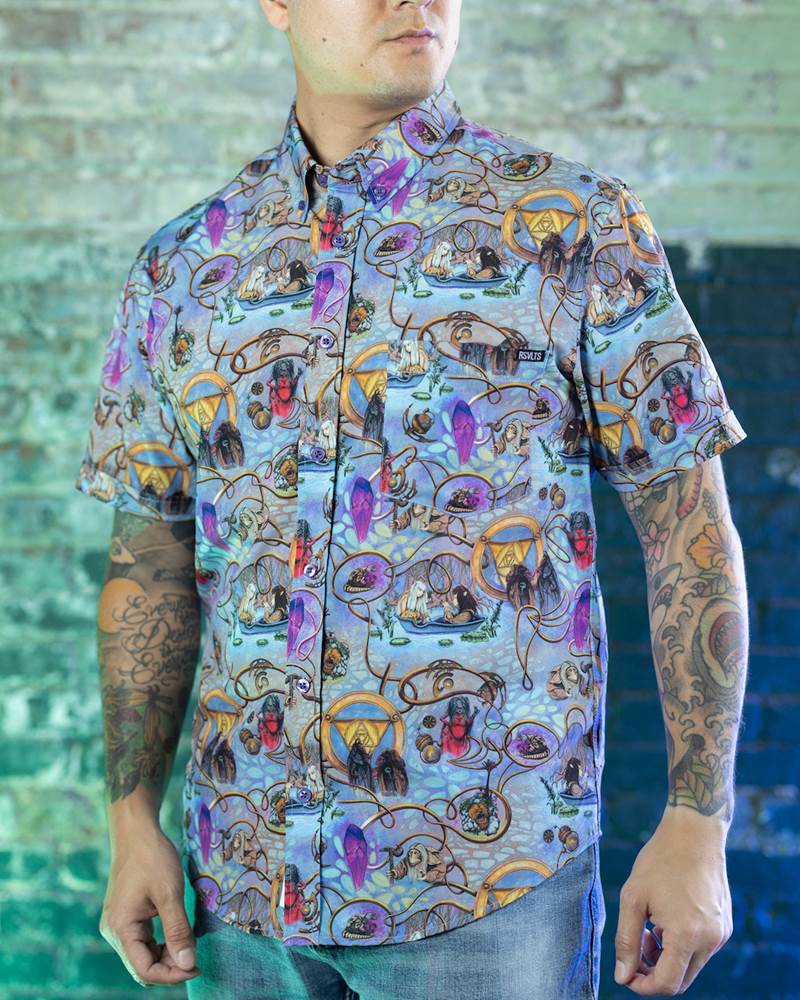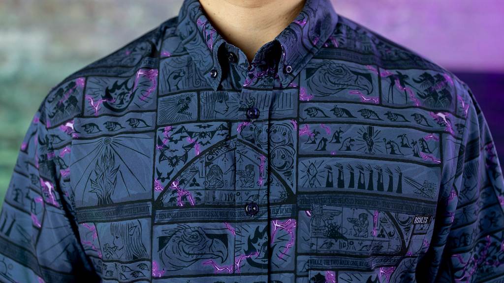 “Bring home Jen, Kira, Fizzgig, Aughra, urSu the Master, and the rest of your favorite residents of Thra on this otherworldly button down. With astronomical symbols, mystical geometry, and the Dark Crystal itself, it’s perfect for any fan of the film – or your spiritual cousin who always smells like sage and blames everything on Mercury retrograde."