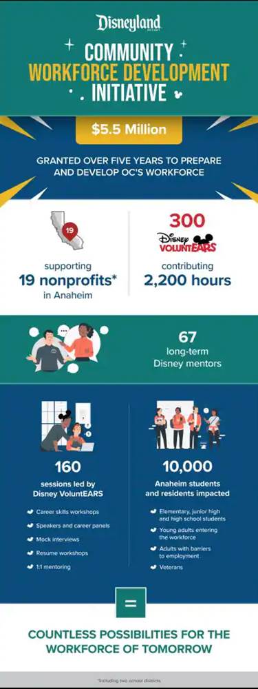 - The Disneyland Resort Workforce Development initiative has reached more than 10,000 lives over the past five years with $5.5 million of contributions to help nonprofits and school districts.