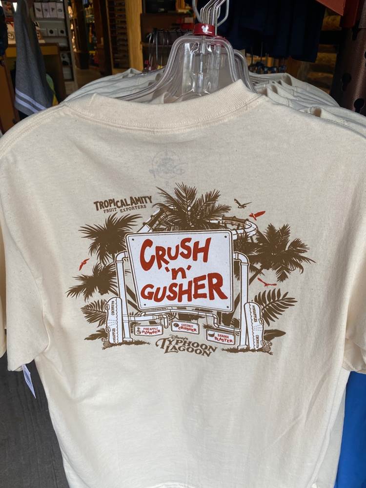 - The second shirt features the Typhoon Lagoon logo in small font on the front, with an artistic representation of Crush ‘n’ Gusher on the back, including the three individual slide names: Pineapple Plunger, Coconut Crusher and Banana Blaster.