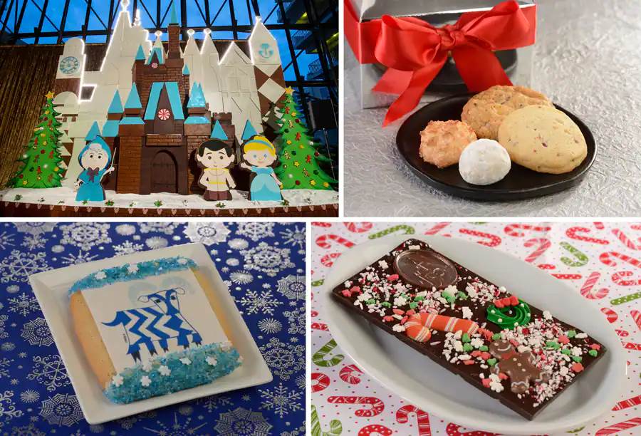 - Freshly baked, homemade items, such as Gingerbread Mickeys and Shingles, Stollen Bread, Brownie Christmas Tree, and Chocolate Peppermint Bark