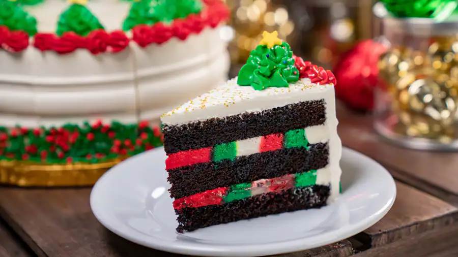 - Holiday Cake: Devil’s food cake with swirled white chocolate mousse filling, buttercream frosting, and holiday sprinkles